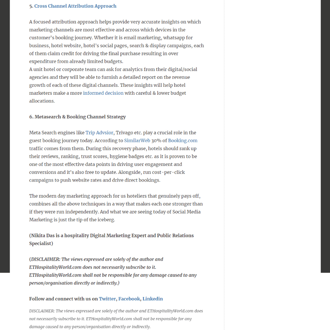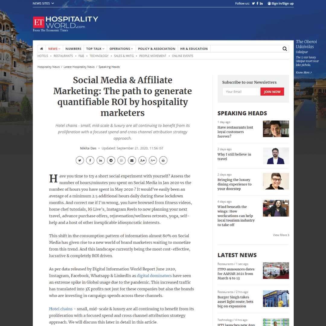 We were asked by ET Hospitality World to share our thoughts regarding some of the latest trends in hospitality marketing within social media and affiliate marketing. Having worked with the world's top hospitality chains such as Taj Hotels, Marriott & Oberoi Hotels, this is what our experience says.
