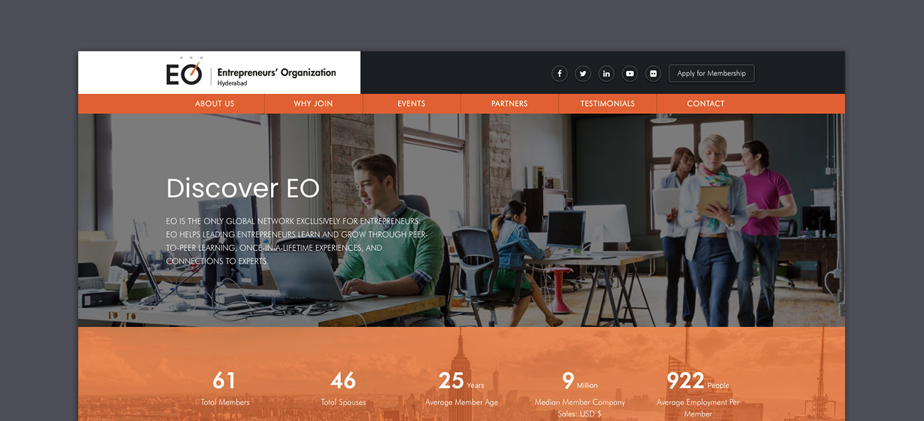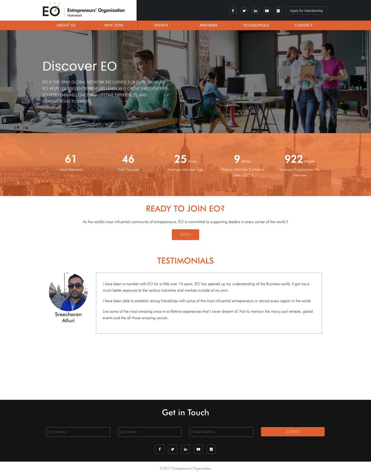 The Entrepreneurs' Organization (EO) Hyderabad chapter was founded more than 16 years ago to help leading business owners on their path to greater business success and personal fulfillment. We were handed the responsibility to build a website to them and we grabbed the opportunity by the horns.