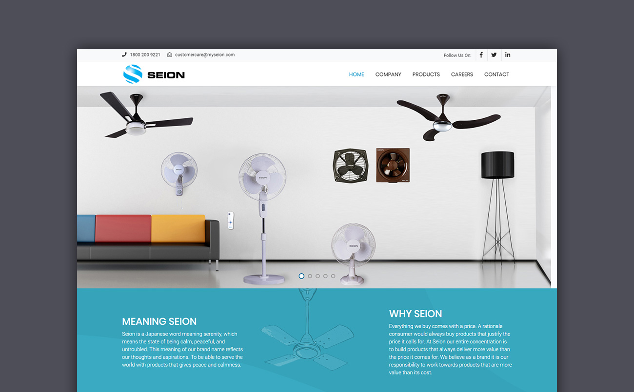 Seion is one of the fastest growing names in the electric fan industry. Being a competitive industry, it was difficult for them to establish the brand name in the Indian Market. The first and foremost thing that could be done was to build a website which is more engaging and attractive. Our expertise and detailed research helped us to design the website in the best way that it is helping them to convert the maximum of the website visitors into customers.