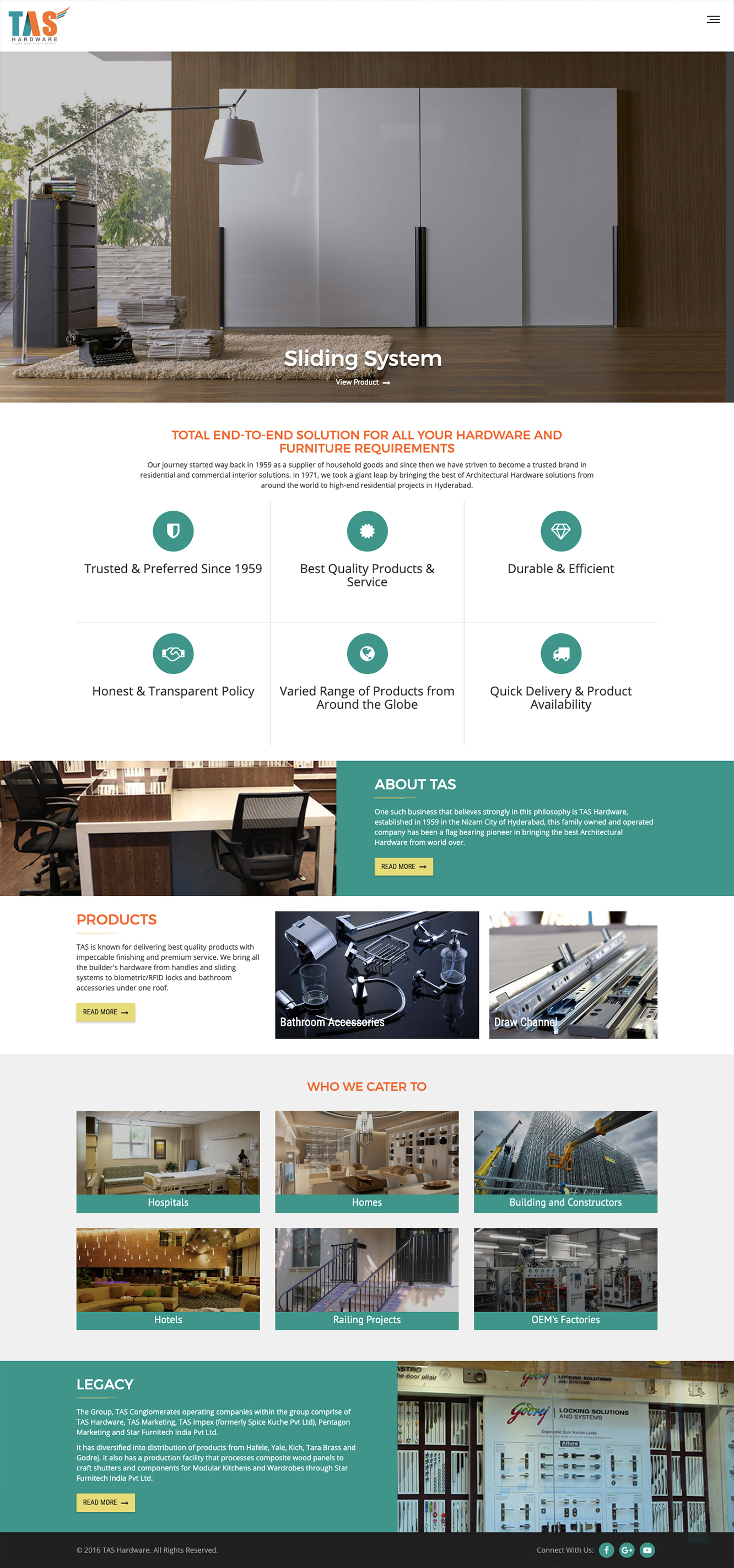 With a 60-year-old legacy in architectural hardware, TAS Hardware is one of our most cherished clients. We've built them a beautiful responsive website where they not only showcase their products but also flaunt their accolades & projects.